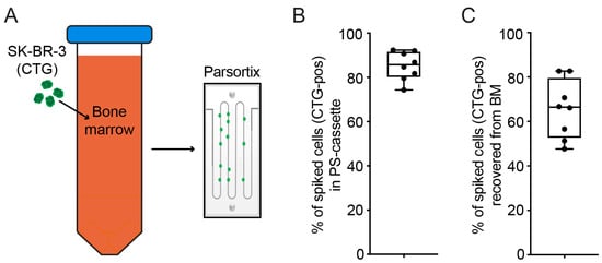 As we suspected that the PBMC isolation step was the limiting factor, we wanted to evaluate if microfluidic separation using whole BM instead of PBMCs would result in higher numbers of harvested DTCs. To this end, CTG-labeled SK-BR-3 cells were spiked into fresh whole BM prior to processing with Parsortix (Figure 2A; see the Methods section for details). In the first step, the Parsortix system enriches cells in a separation cassette. The enriched cells can then either be used directly in the cassette (e.g., for immunofluorescence staining) or washed out of the cassette for downstream analysis. We therefore first evaluated how many cells can be captured in the cassette (Figure 2B), and second, we evaluated how many cells can be recovered from the cassette (Figure 2C). When using the Parsortix method with whole BM, a mean of 85.2% (Q1–Q3: 81.1–91.0%; median 85.7%) of spiked cells could be captured in the separation cassette (Figure 2B). By counting the number of cells retained in the enrichment cassettes after the final harvest step, we were able to calculate the overall percentage of cells recovered when using Parsortix (Figure 2C). On average, 65.6% (Q1–Q3: 55.3–73.7%; median 66.4%) of spiked SK-BR-3 cells could be enriched using this method (Figure 2C), resulting in an average cell loss of 34.4% during the entire process. Therefore, when using the Parsortix cell separation method with whole BM, a four-fold increase in the number of harvested cells could be achieved compared to the standard method of using a density centrifugation step to obtain PBMCs (compare Figure 1B and Figure 2C; 14.9% vs. 65.6%, p = 0.0002).