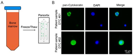 Recovery of patient DTCs from cryopreserved BM. (A) Workflow of experiment; BM samples were cryopreserved and subsequently thawed for Parsortix enrichment (see Methods for details). (B) Immunofluorescence images of harvested cells. DTCs can be identified as pan-CK+/DAPI+, and mononuclear cells can be identified as pan-CK-/DAPI+.