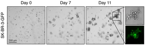 As cryopreservation and the harvesting of large numbers of DTCs from BM appears to be feasible, we wanted to explore the possibilities for downstream cell characterization and analysis offered by microfluidic cell separation from whole BM. Knowing that this method could potentially yield high numbers of DTCs (Table 4 and Supplementary Figure S2), we wanted to assess whether performing cell cultures of harvested DTCs after microfluidic cell separation might be feasible. As patient-derived tumor cells have been shown to exhibit improved proliferation in 3D cultures, we decided to evaluate the possibility of generating organoid cultures of breast cancer cells. To this end, SK-BR-3-GFP cells were spiked into fresh whole BM prior to cryopreservation, followed by cell separation using Parsortix after thawing. The harvested cells were plated in extracellular matrix surrogate basement membrane extract, and their ability to form 3D organoids was evaluated. Indeed, organoids, exhibiting the characteristic SK-BR-3 grape-like growth morphology [], formed and proliferated for at least 21 days (Figure 4).