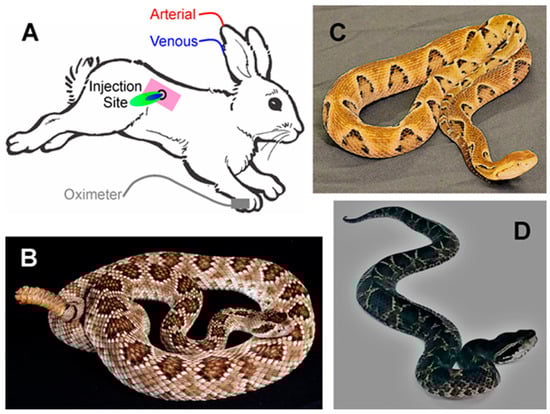 (A) Rabbit model of envenomation. Blue area indicates site of venom injection, with green indicating the antivenom injection. (B) The Mojave rattlesnake, Crotalus scutulatus scutulatus. (C) The Brazilian lancehead, Bothrops moojeni. (D) The Malayan pit viper, Calloselasma rhodostoma. The photographs of the snakes were kindly provided by the National Natural Toxins Research Center at Texas A&M University-Kingsville, Kingsville, TX, USA.