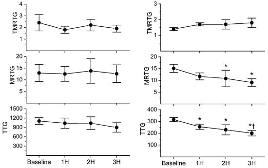 Comparison of whole blood and plasmatic coagulation after C. s. scutulatus envenomation. Left panel—There was no significant change in whole blood coagulation following envenomation with C. s. scutulatus venom. Right panel—C. s. scutulatus venom injection resulted in a significant decrease in MRTG (dynes/cm2/second) and TTG (dynes/cm2) without affecting TMRTG (minutes). Data presented as mean ± SD; 1H, 2H, and 3H are hours after venom injection; * p < 0.05 vs. baseline; † p < 0.05 vs. 1H.