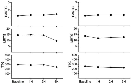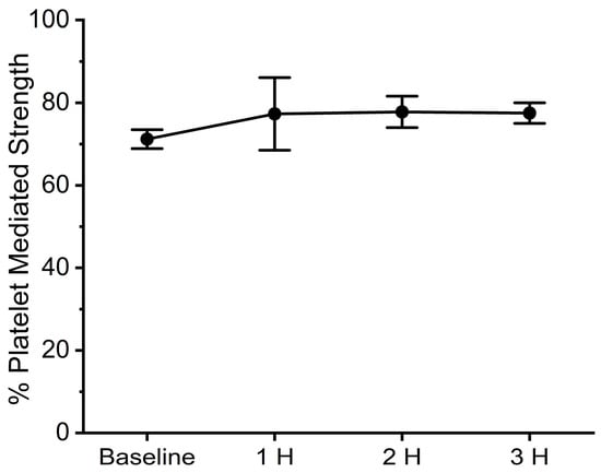 With regard to coagulation, this dose of C. s. scutulatus venom had no significant effect on whole blood coagulation, as presented in Figure 4, left panel. In contrast, plasmatic coagulation had a significant decrease in MRTG values two and three hours after envenomation compared to baseline values, as noted in Figure 4, right panel. Further, a decrease in TTG values throughout experimentation after envenomation was also observed. Also of interest, there was no change in the contribution of platelet-mediated clot strength, as displayed in Figure 5. These data are characteristic of the effects of a primarily fibrinogenolytic venom with minimal effects on platelets [,,].