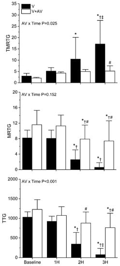 Effects of B. moojeni venom injection without or with antivenom treatment on whole blood coagulation. V (black bars) = rabbits injected with venom; V + A (white bars) = rabbits administered antivenom after venom injection. TMRTG (minutes); MRTG (dynes/cm2/second; TTG (dynes/cm2). Data presented as mean ± SD; 1H, 2H, and 3H are hours after venom injection; * p < 0.05 vs. baseline; † p < 0.05 vs. 1H; ‡ p < 0.05 vs. 2H; # p < 0.05 vs. V. AV × Time = result of two-way ANOVA to determine interaction of time with antivenom administration.