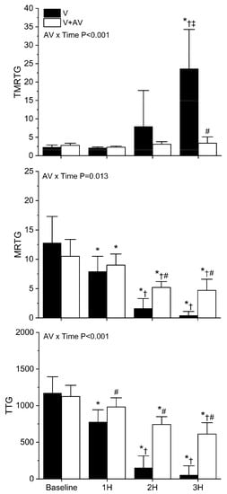 Effects of C. rhodostoma venom injection without or with antivenom treatment on whole blood coagulation. V (black bars) = rabbits injected with venom; V + A (white bars) = rabbits administered antivenom after venom injection. TMRTG (minutes); MRTG (dynes/cm2/second; TTG (dynes/cm2). Data presented as mean ± SD; 1H, 2H, and 3H are hours after venom injection; * p < 0.05 vs. baseline; † p < 0.05 vs. 1H; ‡ p < 0.05 vs. 2H; # p < 0.05 vs. V. AV × Time = result of two-way ANOVA to determine interaction of time with antivenom administration.