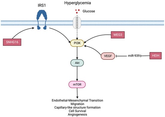 Hyperglycemia results in a reduction in MEG3 levels in retinal endothelial cells and diabetic retinas that increases retinal angiogenesis and can aggravate vascular leakage and inflammation. MEG3 activates the PI3K/Akt signaling pathway and regulates retinal endothelial cell function in vivo and in vitro. The PI3K-Akt signaling axis is activated by hyperglycemia in endothelial cells and regulates multiple critical steps in angiogenesis, including endothelial cell survival, migration and capillary-like structure formation. Abnormal PI3K-Akt signaling could lead to abnormal cellular proliferation. Research shows that MEG3 knockdown has no effect on the amount of total Akt and PI3K, but it increases phosphorylated levels of Akt and PI3K. MEG3 knockdown promoted an increase in endothelial cell viability that was interrupted by PI3K inhibitors []. PI3K, AKT and mTOR were co-activated and involved in the regulation of cellular processes; PI3K could activate its downstream component AKT, which subsequently could induce the effector mTOR.