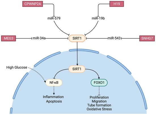 A recent study revealed that after HG treatment of RPE cells, MEG3 promotes the expression of Sirt1 by acting as a sponge for miR-34a, thus inhibiting the activation of the NF-κB pathway triggered by HG and inhibiting the activation of Müller cells as well as the inflammatory response and apoptosis.