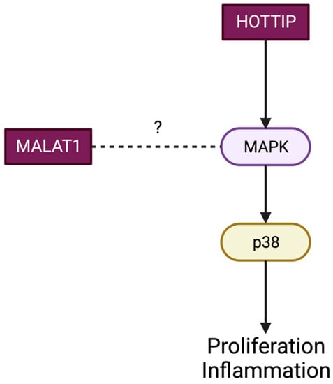 Moreover, MALAT1 may regulate cell proliferation via p38 MAPK signaling pathways. Studies showed that MALAT1 knockdown significantly changes the levels of phosphorylated p38 MAPKs but has no effect on the levels of phosphorylated ERK1/2 or JNK1/2 and that its effects could be specifically blocked by a p38 MAPK pathway inhibitor or p38 siRNA. This indicates that there is a crosstalk between MALAT1 and p38 MAPK signaling, but further studies are needed to comprehend this association [].