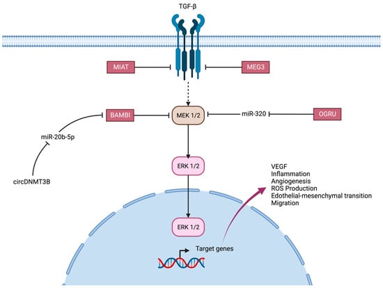 Lastly, studies showed that H19 overexpression prevented glucose-induced EndMT through TGF-β signaling via a blockade of the MAPK–ERK1/2 pathway; this action is independent of miR-200b, a miRNA previously shown to regulate diabetes-induced EndMT. TGF-β is known to be the major regulator of EndMT, and it induces its profibrotic properties by increasing fibroblast proliferation. It was also demonstrated that H19 regulated the production of phosphorylated ERK1/2 proteins, so H19 facilitates this regulation by suppressing TGF-β1 and its signaling pathways by repressing the MAPK–ERK1/2 signaling pathway [].