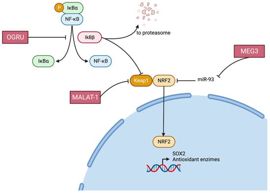 MALAT1 also plays an important role in maintaining the antioxidant defense system. Recent data show that hyperglycemia increases Sp1 binding at the MALAT1 promoter in retinal microvasculature, thus increasing Lnc-RNA MALAT1 expression. MALAT1, in turn, enhances the binding of Sp1 at the Keap1 promoter to activate its transcription. High levels of Keap1 impede Nrf2 nuclear movement, hindering the transcription of the antioxidant response enzymes. Inhibition of Lnc-RNA MALAT1 by its siRNA blocks Keap1 upregulation, freeing Nrf2 to translocate in the nucleus and help the transcription of antioxidant genes HO1 and Sod2. These results were obtained in vitro (human retinal endothelial Cells (HRECs)), in vivo (diabetic mice), and in retinal microvessels from human donors with diabetic retinopathy [].