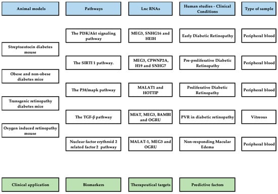 Several studies found that hyperglycemia causes a significant upregulation of Lnc-MALAT1 level in retinal endothelial cells and diabetic retinas and that silencing of MALAT1 decreases retinal vascularization, vascular leakage and retinal inflammation []. Furthermore, MALAT1 is upregulated in the vitreous humor, aqueous humor samples and fibrovascular membranes of diabetic patients.