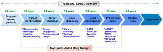 Computer-aided drug design (CADD) provides new ideas for rational drug molecular design and promotes significant breakthroughs in drug molecular design. In 1981, the cover article of Fortune “Next Industrial Revolution: Designing Drugs by Computer at Merck” marked the formal entry of CADD into the field of pharmaceutical research [30]. Subsequently, the Nobel Prize in Chemistry in 1998 and 2013 was awarded for related work in molecular simulation, demonstrating that experiments and theory are twin pillars in chemistry. In the past few decades, scientists have developed a variety of CADD methods, including sequence alignment [31], homologous modeling [32], molecular docking [33], pharmacophore [34], quantitative structure–activity relationship [35], molecular dynamics [36], and quantum mechanics [37]. These methods have been adopted at different stages of drug development. Compared with traditional drug R&D methods, CADD reduces the high cost, decreases the high-risk problems, shortens the cycle time, and improves the efficiency of new drug development (Figure 1). Due to its remarkable advantages, CADD has been used to successfully develop many drugs, including Donepizil (treatment of Alzheimer’s disease), Zanamivir (anti-virus), Imatinib (anti-tumor), Saquinavir (treatment of immunodeficiency virus) and so on [38,39,40].