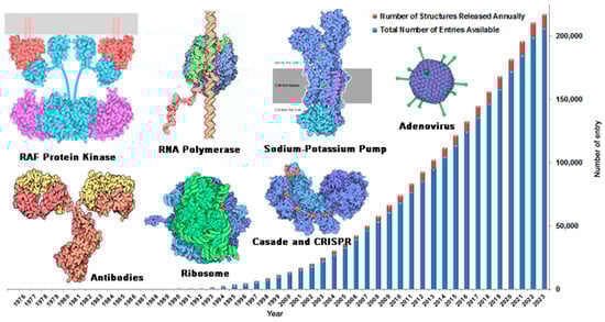 To achieve rational structure-based drug design, it is necessary to fully understand the three-dimensional structure of targets. Structural biology is devoted to studying the complete, accurate, and real-time three-dimensional structure of biological macromolecules via experimental means [41,42]. The structures of a large number of biological macromolecules have been resolved using structural biology technology. Structural data of biological macromolecules are collected in the Protein Structure Database (PDB, https://://www.rcsb.org, accessed on 16 July 2023). As of July 2023, information on 207,540 biological macromolecular structures has been collected in the PDB database and the number of structures is increasing rapidly—by nearly 10,000 pieces per year (Figure 3). The structures of macromolecules include a variety of drug targets associated with major human diseases, including antitumor [43], antibacterial [44], antiviral [45], Alzheimer’s disease [46], and diabetes [47].