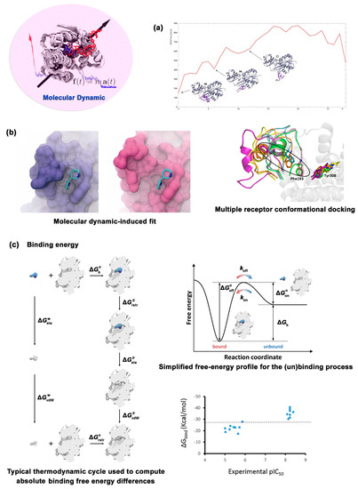 Three applications of MD in drug design. (a) Conformational simulation of flexible protein. (b) Refinement of ligand–target complex structure. (c) Calculation of binding energy. Figures are taken from refs. [81,86].