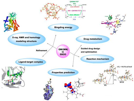 QM/MM has gradually become a powerful tool in biology, crystal engineering, material science, and supramolecule fields. In drug design, QM/MM is used to refine the structure of ligand–receptor complexes, calculate the binding energy between ligand and receptor, predict physical and chemical properties (charge density, pKa, water solubility, etc.) of ligands, and simulate the action of endogenous ligands, drug metabolism pathway, and drug resistance mechanism (Figure 7) [119,120,121,122]. In summary, QM/MM provides more refined structural and property parameters for structure-based drug design and has been used to assist in the study of drug targets such as tubulin [123], human carbonic anhydrase (hCAII) [124], cyclin-dependent kinase 2 (CDK2) [125], and lipoxygenase [126].