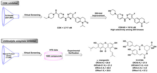 Virtual screening (VS) technology is a method of screening potential active compounds by evaluating the binding energy between compounds and targets in small molecule databases [129]. Molecular docking is ordinarily used in the VS process, thus VS is a rapid and cheap drug screening method. The commonly used databases of small molecular compounds are Zinc (https://zinc.docking.org/, accessed on 16 July 2023), DrugBank (https://www.drugbank.com/, accessed on 16 July 2023), PubChem (https://pubchem.ncbi.nlm.nih.gov/, accessed on 16 July 2023), ChEMBL (https://pubchem.ncbi.nlm.nih.gov/source/ChEMBL, accessed on 16 July 2023), and BindingDB (https://www.bindingdb.org/, accessed on 16 July 2023). Virtual screening has become a common method in drug screening, especially in screening hit-or-lead with novel skeletons. Its great potential and value have been confirmed by the discovery of various drugs such as cyclin-dependent kinase (CDK) inhibitors [130], chitinolytic enzyme inhibitors [131], and anti-coronavirus SARA-CoV-2 compounds [132] (Figure 9). For example, Yuan et al. screened a lead compound as a CDK inhibitor from an in-house database; further chemical optimization led to the highly selective and potent CDK4/6 inhibitor.