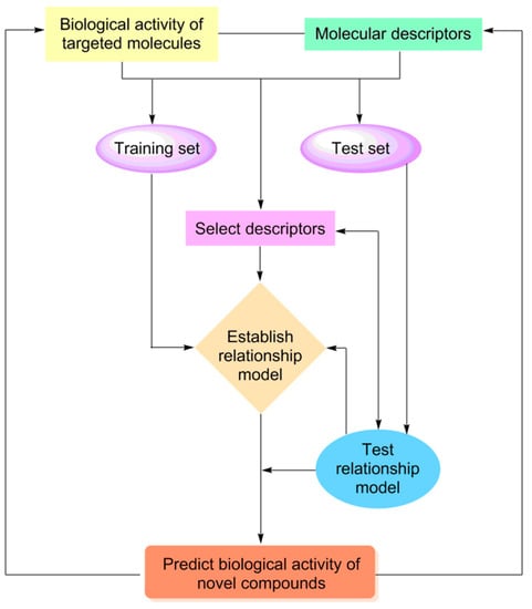 Quantitative structure–activity relationship (QSAR) is the main method of exploring the relationship between the structures and properties of compounds. The theoretical basis of this method is that the structural characteristics of a series of compounds with similar structures and the same mechanism of action are correlated with their activities/properties (Figure 10) [140,141,142]. In a broad sense, QSAR activity includes physiological and biochemical indexes (e.g., pharmacological activity, enzyme inhibition toxicity, and neurotoxicity) and physical and chemical properties (e.g., solubility, retention time, lipid–water partition coefficient, reaction rate constant, boiling point, and melting point) [141]. In pharmaceutical research, QSAR research follows the following steps: first, a mathematical model of the structures and activities/properties of known or assumed drug molecules or active compounds is generated using statistical methods to reveal the mechanism and mode of action of drug molecules; the obtained mathematical model is then used to quantitatively explain and predict the activities and properties of unknown compounds, to optimize and design drug molecules rationally and effectively. At present, QSAR is widely used in the pharmaceutical field for the prediction of the pharmacological activity of compounds, discovery and optimization of lead compounds, and evaluation of absorption, distribution, metabolism, excretion, and toxicity (ADMET) and other drug properties [142,143,144,145,146,147].