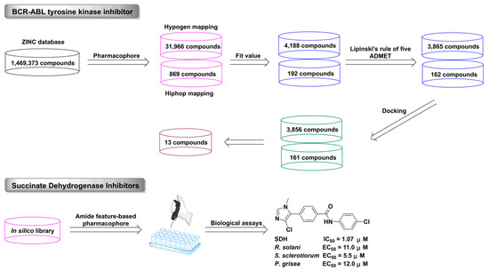 The discovery process for BCR-ABL tyrosine and succinate dehydrogenase inhibitors using the pharmacophore approach.