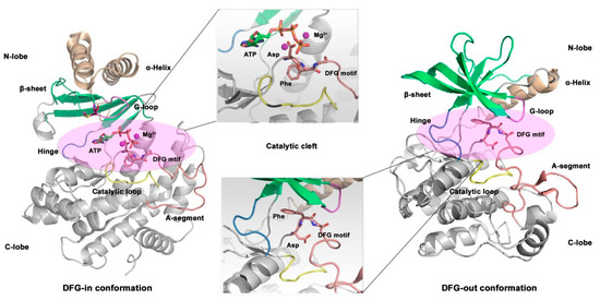 The general structure of kinases is shown in Figure 14. It includes a catalytic domain, a helical domain, and multiple binding domains. The function of kinases is to phosphorylate substrates, thus its catalytic domain is highly conserved, and the three-dimensional structures of different kinases are very similar. The catalytic domain is composed of a bilobate region linked by a hinge region, a G-loop region (also known as P-loop), a catalytic loop, and an activation loop (A-segment). Bilobate regions are located at the C- and N-termini of kinases, called C-lobe and N-lobe fragments, respectively. The N-lobe is composed of five β-sheets and an α-helix, while the C-lobe is mainly composed of α-helix structures. The catalytic cleft between the bilobate region is an ATP binding site and is also the binding site for most ATP-competitive kinase inhibitors [175,176,177].