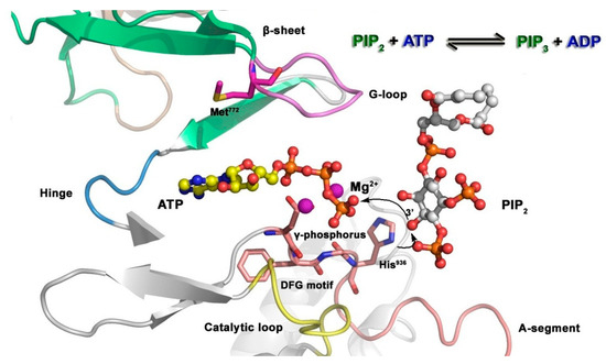 The mechanism of substrate phosphorylation that is catalyzed by kinases [182] is shown in Figure 16. Phosphatidylinositol 3 kinase (PI3K) is taken as an example to describe the phosphorylation of the substrate: first, ATP and substrate phosphatidylinositol 4,5-biphosphate (PIP2) bind to the catalytic domain of PI3K, and the activation loop, phosphate groups of ATP, and Mg2+ ions form a molecular interaction; His936 then captures protons from PIP2, allowing PIP2 to act as a nucleophile and attack the γ-phosphoryl group; finally, the phosphoryl group is transferred to PIP2 to generate phosphatidylinositol-3,4,5-triphosphate (PIP3), thus completing the phosphorylation process.
