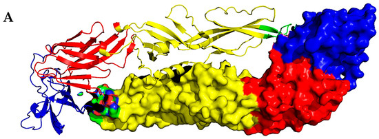We performed an in silico three-dimensional visualization of the rEZIKV protein structure, which showed high similarity with the sequence deposited in the Protein Data Bank (PDB ID 5JHM). For this purpose, we have used the dimeric representation of rEZIKV, in which one monomer was represented as a cartoon diagram and the other as a surface epitope display, highlighting the envelope protein domains I, II, and III, and the fusion loop (Figure 1A).