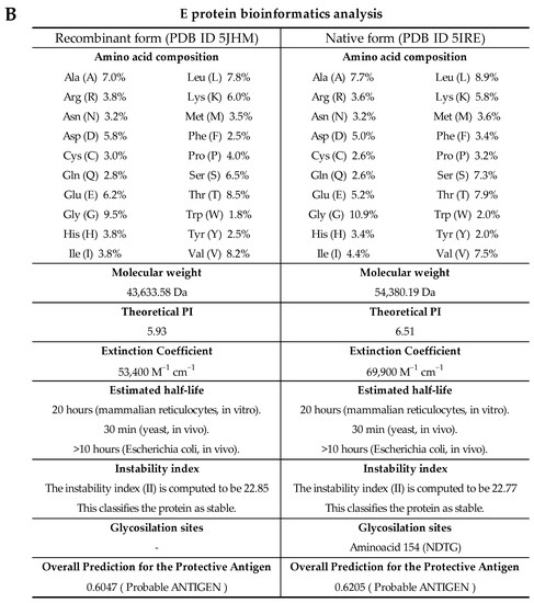Bioinformatics analysis of biochemical properties of ZIKV envelope protein. (A) Dimer representation of EZIKV using a ribbon diagram and a surface epitope display representation (PDB ID 5JHM). EZIKV protein is represented as colored red (Domain I), yellow (Domain II), blue (Domain III), and green (fusion loop). (B) In silico analysis of recombinant EZIKV and native EZIKV biochemical properties.