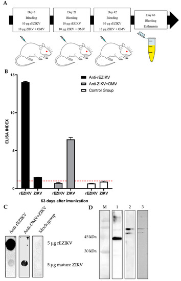 For immunization, 3 groups of 5 mice were used, and each group received 3 doses subcutaneously by injection in the back, with 10 µg of antigen at each dose diluted in sterile PBS with 50% (v/v) of complete (first dose) or incomplete (second and third doses) Freund’s adjuvant, at 21-day intervals (Figure 4A). Group 1 mice were immunized with the rEZIKV protein. Group 2 was immunized with outer membrane nanovesicles of Neisseria meningitidis conjugated to mature ZIKV (OMV+ZIKV), kindly provided by Dr. Marcelo Lancellotti [51]. Group 3 was the mock group and received only sterile PBS solution with 50% (v/v) of Freund’s adjuvant. Blood was collected via the submandibular vein on day 0 (pre-immune) and at a frequency of 21 days after each dose. In total, 4 blood collection time points were established: pre-immune, and 21 days after the first, second, and third doses. Mice were euthanized 3 weeks after the third dose by deep anesthesia with ketamine/xylazine use (140 mg/kg and 10 mg/kg, respectively). The blood samples were centrifuged at 3000× g for 15 min at room temperature and the serum was collected and transferred to new microtubes and stored at −20 °C.