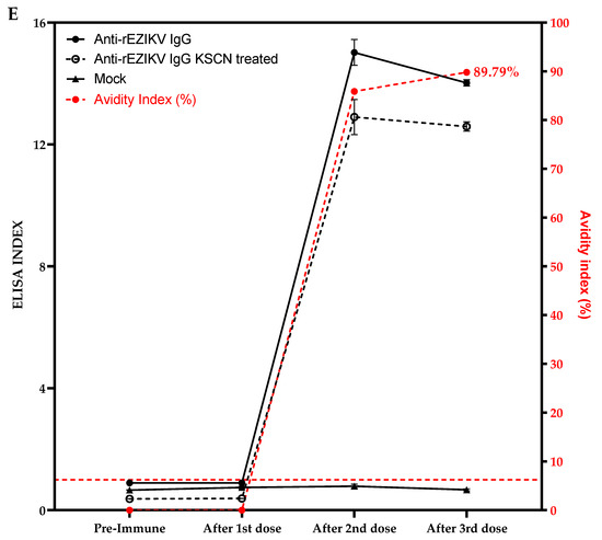 The serum from the anti-rEZIKV group was also evaluated for the binding strength of IgG antibodies against the rEZIKV protein, measured as the avidity index (AI). The results showed that after the first dose, the rEZIKV immunization did not generate an immune response against the rEZIKV. However, after a boost dose, the reactivity against the rEZIKV had an approximately 17-fold increase in the ELISA index, maintaining increased levels after a third boost. This increase in immune responses also implied increased levels of avidity after the boost dose, reaching approximately 86% of avidity at this point, whereas after the last dose, the avidity level reached approximately 90% (Figure 4E). The mock group serum showed no reactivity against the rEZIKV after any of the doses.