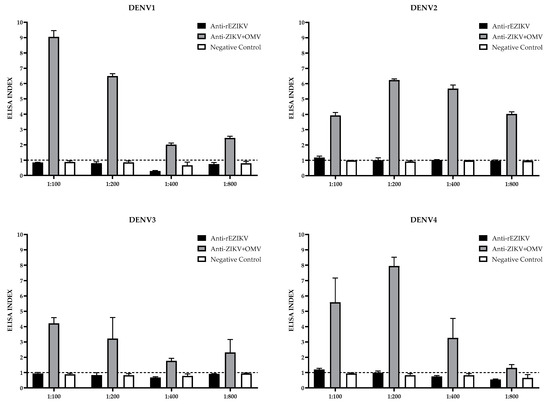 To evaluate the cross-reactivity of the rEZIKV and OMV+ZIKV immunization against the four DENV serotypes, an ELISA was performed using post-third-dose mice serum. Serum from animals immunized with rEZIKV did not react against DENV1 and DENV3 particles at any dilution. However, against DENV2 and DENV4 particles, it showed a slight reactivity (1.171 and 1.164 of Elisa Index, respectively), at 1:100 dilution. Serum from animals immunized with OMV+ZIKV reacted with all DENV serotypes in all dilutions tested. As expected, serum samples from the mock group did not react against any DENV serotype (Figure 5).