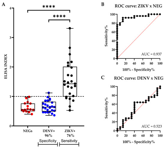 Antigenic potential of rEZIKV by ELISA. (A) Levels of antibodies against rEZIKV, in 15 negative serum samples for both DENV and ZIKV (red dots), 25 serum samples from patients with DENV natural infection (blue dots), and 25 serum samples from patients with ZIKV natural infections (black dots). (B) Receiver Operating Characteristic (ROC) curves show the rEZIKV IgG-ELISA’s diagnostic performance for ZIKV positive compared to negative samples. (C) Receiver Operating Characteristic (ROC) curves show the rEZIKV IgG-ELISA’s diagnostic performance for DENV positive samples compared to negative samples. The ELISA data were expressed as an ELISA index (EI) and the dotted black line shows the cut-off value. EI > 1 values were considered positive. Statistical comparisons between ZIKV positive samples and DENV positive, or negative, samples were determined by one-way analysis of variance (ANOVA), with Tukey as post-test. p values < 0.05 indicate statistically significant differences (**** p < 0.0001). AUC: Area under the curve.