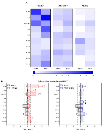 Cytokine mRNA profiles of BALB/c mice splenocytes cells stimulated with rEZIKV and ZIKV mature particles in vitro. (A) Heat map visualization comparing the mRNA cytokine expression profile between immunized and mock groups. (B) Comparison of mRNA transcript expression after rEZIKV stimulation in vitro. (C) Comparison of mRNA transcript expression after mature ZIKV antigens stimulation in vitro. mRNA expression of IL-1β, IL-6, GM-CSF, IL-2, IL-4, IL-17, IFN-γ, IL-10, IL-35, and TGF-β from splenocytes was detected by RT-qPCR. The mean basal mRNA expression for each group is equal to 1. The data are expressed as fold change of a target gene expression in comparison with a reference gene expression of GAPDH mRNA for each representative basal control. Red column: mice group immunized with rEZIKV. Blue column: mice group immunized with OMV+ZIKV. Black column: mock group. Statistically significant differences of cytokine transcripts levels between immunized and mock groups in RT-qPCR assay were determined by unpaired t-test or Mann–Whitney test, when appropriate. The data are expressed as the mean ± SD for each group. p values < 0.05 indicate statistically significant differences (* p < 0.05; ** p < 0.01; *** p < 0.0001).