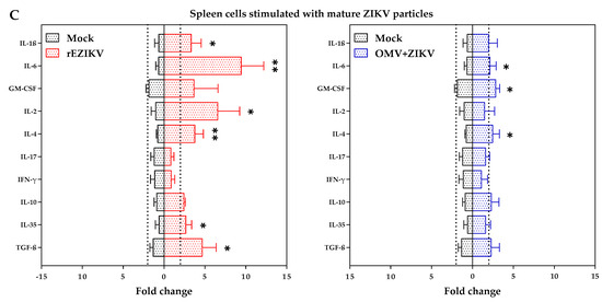 After BALB/c mice immunization, the ability of rEZIKV and OMV+ZIKV in inducing cellular immune response was investigated by measuring the mRNA expression level of cytokines after spleen cells in vitro antigen (rEZIKV or ZIKV particle) stimulation (Figure 7A). The results showed that splenocytes from animals immunized and stimulated with rEZIKV showed higher expression levels mainly for Interleukin (IL)-1β, IL-6, and Granulocyte-Macrophage Colony-Stimulating Factor (GM-CSF) cytokines (p < 0.05) (Figure 7B). The levels of the cytokine IL-4 (p = 0.0010) in the OMV+ZIKV immunized group that was further stimulated with rEZIKV were significantly higher than those in the mock group (Figure 7B). On the other hand, IL-4, IL-6, and GM-CSF (p < 0.05) showed a difference on spleen cells from mice immunized with OMV+ZIKV and further stimulated with ZIKV particles (Figure 7C). Lastly, the rEZIKV immunized group that was further stimulated with ZIKV particles showed an increase in mRNA levels for IL-1β, IL-2, IL-4, IL-6, IL-35, and Transforming Growth Factor (TGF)-β cytokines (p < 0.05) (Figure 7C).