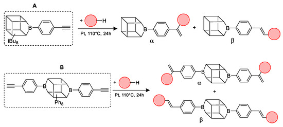 General hydrosilylation scheme of (A) monoethynylphenylborasilsesquioxane and (B) diethynylphenylborasilsesquioxane with compound bearing Si–H moiety.
