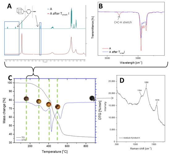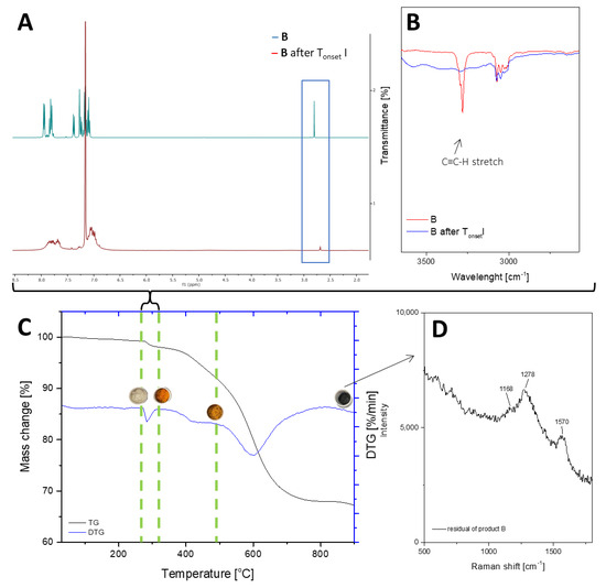 TGA and DTG curves of A—monoethynylphenylborasilsesquioxane in a nitrogen atmosphere (C). The graph has been divided into stages of decomposition. Additional photos and spectroscopy analysis (1H NMR (A), FT-IR (B), Raman (D)) show the sample’s appearance and changes in structure before individual stages.
