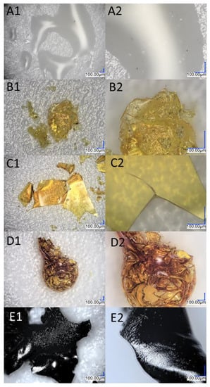 Images from an optical microscope depicting the various stages of the monoethynylphenylborasilsesquioxane decomposition process. (A1,A2) Before first stage of degradation; (B1,B2) after first stage of degradation; (C1,C2) after the second stage of degradation; (D1,D2) after the third stage of degradation; (E1,E2) residual after the process.