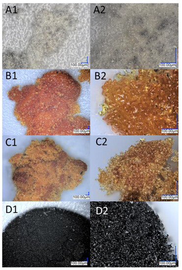 Images from an optical microscope showing the various stages of the diethynylphenylborasilsesquioxane decomposition process. (A1,A2) Before the first stage of degradation; (B1,B2) after the first stage of degradation; (C1,C2) after the second stage of degradation; (D1,D2) residual after the process.