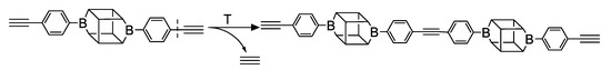Monosubstituted and diethynylphenyllborasilsesquioxane were obtained by a condensation reaction of Disilanolisobuthyl POSS and Tetrasilanolphenyl POSS, respectively, with 4-ethynylphenylboronic acid, with the azeotrophic elimination of stoichiometrically formed water. This preparation strategy enables the obtaining of quantitative yields, with the details described in our previous work [37,38].
