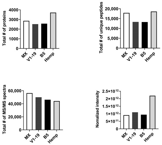 Approximately 2500–3000 total number of proteins were identified in protein extract generated from the three distinct cannabis chemotypes, while hemp ~3700 proteins were identified in the protein extract generated from hemp (Figure 1, top left panel). Further, the total number of unique peptides identified in each sample was >13,000, being highest for hemp (18,592), followed by the Mx (17,889), V1-19 (13,310) and B5 (13,237) chemotypes of cannabis (Figure 1, top right panel). The total number of MS/MS spectra acquired were comparable between all strains of cannabis, with the Mx strain yielding maximum MS/MS spectra (Figure 1, bottom left panel). Finally, regarding the normalized LFQ intensity, while comparable between the three distinct cannabis chemotypes (range 9.1 × 1011–1.1 × 1012), LFPQ intensity was highest for the hemp strain (2.2 × 1012) (Figure 1 bottom right panel). It is essential to note here that while quantitative measures can be compared between the Mx, V1-19 and B5 strains of cannabis, hemp extracts were generated using distinct protein extraction method and analyzed separately, thus yielding differential LFQ intensities that limit direct quantitative comparisons.