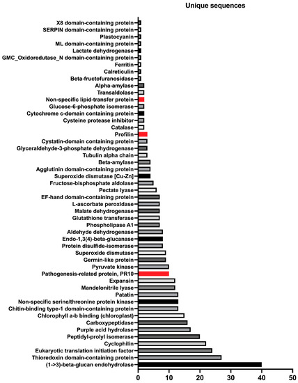 Putative allergens in cannabis detected via the LC-MS/MS approach. Graph represents the number of unique sequences identified for each putative allergen. Validated allergens from cannabis are highlighted in red.