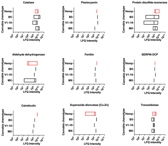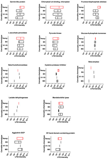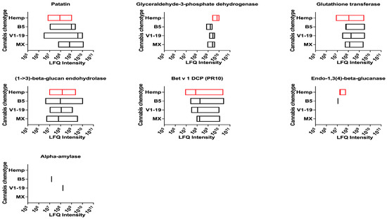 Our preliminary analysis of peptide acquisition and protein sequences from LC-MS/MS revealed higher counts for hemp. Further, the total LFQ intensity was also very high for hemp extracts. This could be possibly explained by the method used for generating protein extracts compared to the method used for isolating proteins from the three different chemotypes of cannabis (Mx, B5 and V1-19 strains).