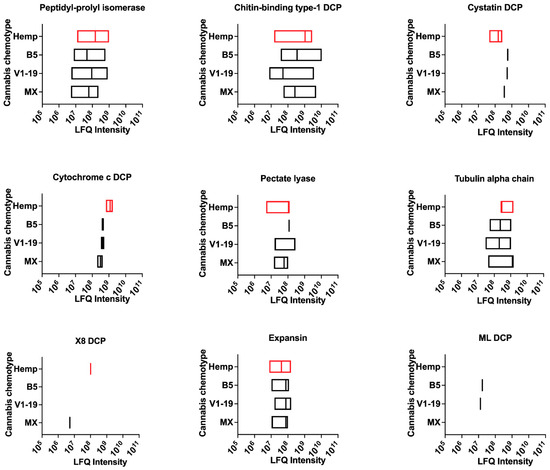 Putative contact allergens in cannabis chemotypes and hemp. LFQ intensities for putative contact allergens present in cannabis. DCP—domain-containing protein. LFQ—relative label-free quantification. Data variance represents LFQ intensity for different unique sequences in the database for each protein.