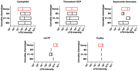 Dual allergens in cannabis chemotypes and hemp. LFQ intensities for seven potential dual routes (allergen–food or contact–food) allergens in cannabis. DCP—domain-containing protein. LFQ—relative label-free quantification. Data variance represents LFQ intensity for different unique sequences in the database for each protein.