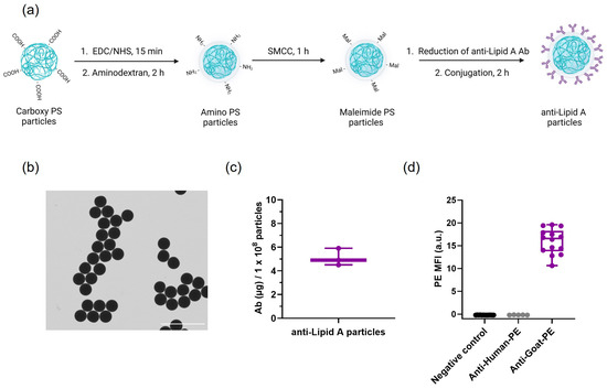 Anti-Lipid A particles were prepared through a three-step conjugation as depicted in Figure 1a. In short, carboxylic acid groups on the surface of 3 µm PS particles were activated and covalently bound to aminodextran to yield amino-PS particles. Subsequent activation of primary amines with maleimides allowed for the attachment of reduced anti-Lipid A antibodies (Ab) via Michael addition.