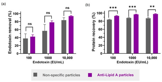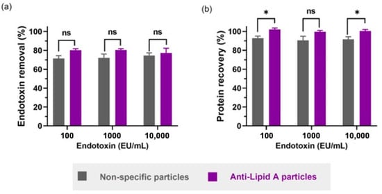 As previously mentioned, protein recovery is a crucial index to the selection of an endotoxin removal system, where the unwanted non-specific removal of protein components should be minimized or, ideally, avoided. When comparing the protein recovery performance of both particle types, a statistically significantly higher protein recovery yield was observed upon use of anti-Lipid A particles (Figure 3b). Notably, for these particles, the protein recovery slightly increased with higher LPS concentrations (93.2%, 96.8% and 97.8% for 100, 1000 and 10,000 EU/mL, respectively), while the non-specific particles did not follow this trend (84.0%, 88.1% and 87.3% for 100, 1000 and 10,000 EU/mL, respectively). The results obtained here highlighted the role of the specificity layer in reducing the non-specific removal of off-target molecules, allowing for higher protein recovery.