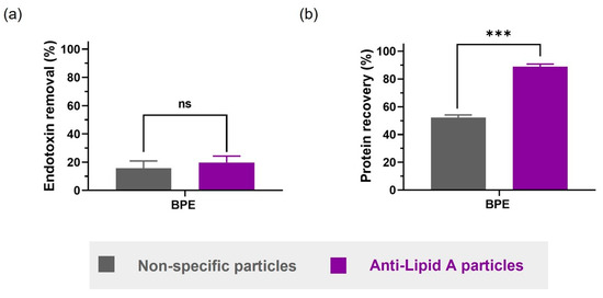 Comparison between anti-Lipid A particles and commercial non-specific particles in BPE in DPBS regarding (a) endotoxin removal and (b) protein recovery. Samples are solutions of BPE in DPBS with natural LPS contamination of unknown source. Data shown are mean ± sem, n ≥ 3, and analyzed with t-test (ns = not significant, *** p < 0.001).