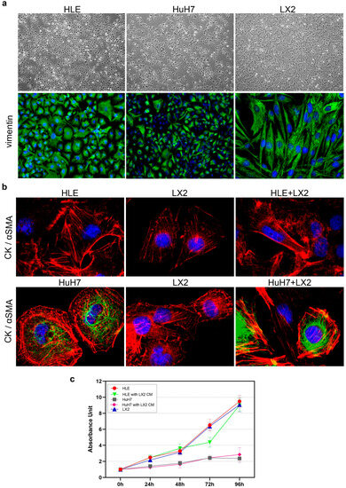 Characterization and proliferation rates of HLE, HuH7, and LX2. (a) Phase contrast micrographs and vimentin immunofluorescence of HLE, HuH7, and LX2 cells. HLE is a dedifferentiated, fast-growing hepatoma cell line whereas HuH7 is more differentiated and grows slower. All three cell lines were positive for vimentin. Vimentin (green) and DAPI (blue). Original magnification: 20× (phase contrast micrographs), 40× (HLE, HuH7 vimentin staining), and 63× (LX2 vimentin staining). (b) Double immunostaining of hepatoma cell lines kept in monoculture or in direct co-culture with LX2 cells. HLE cells did not express cytokeratin and both hepatoma cell lines were positive for αSMA. Cytokeratin (green), αSMA (red), and DAPI (blue). The original magnification in the confocal microscope was 63×. (c) Proliferation rates of HLE, HuH7, and LX2 cells and the effect of LX2-conditioned medium on HLE and HuH7 cell proliferation.