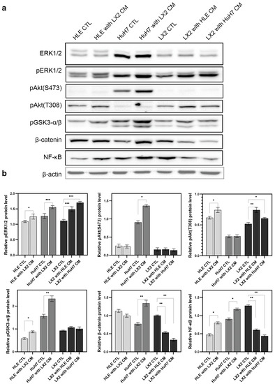 Reciprocal effects of the conditioned media of hepatoma cells and LX2 fibroblasts on cell signaling. Conditioned medium of LX2 activated the Akt/mTOR, MAPK, and NF-κB pathways and inhibited GSK3-α/β in both hepatoma cell lines. In the case of β-catenin, it increased in HuH7 cells and decreased in HLE cells in response to LX2-conditioned medium. Conditioned media of hepatoma cell lines activated ERK1/2 and Akt(T308) but downregulated β-catenin and NF-κB in LX2 cells. (a) Immunoblots and (b) corresponding densitometry graphs. β-actin housekeeping protein was used as a reference for protein loading and relative activity levels were compared to respective controls. Data points represent mean ± SD, n = 3; * p < 0.05; ** p < 0.01; and *** p < 0.001.