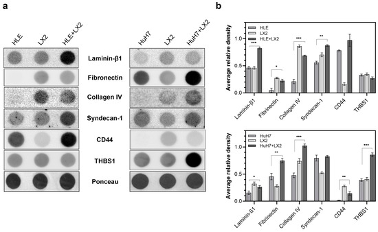 Secretion of matrix proteins into the culture media by single cultures and co-cultures of HLE, HuH7, and LX2. (a) Immunoblots and (b) corresponding densitometry graphs. Ponceau S staining was used as a reference for protein loading. Data points represent mean ± SD, n = 3; * p < 0.05; ** p < 0.01; and *** p < 0.001.