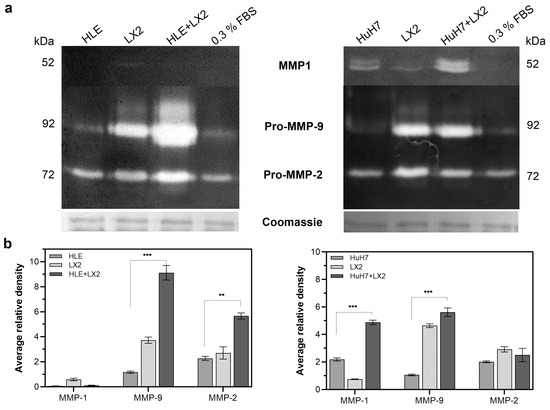 Abundance of MMP-2 and MMP-9 in the media of HLE, HuH7, and LX2 and the direct co-cultures HLE+LX2 and HuH7+LX2. MMP-9 was significantly induced in HLE+LX2 and MMP-1 was significantly induced in HuH7+LX2 compared to the respective monocultures. (a) Bands of zymography assay and (b) corresponding densitometric evaluation normalized to Coomassie staining. Data points represent mean ± SD, n = 3; ** p < 0.01; and *** p < 0.001.