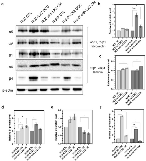 Expression of integrins that bind to laminin and fibronectin in HLE and HuH7 cells, alone or in co-culture with LX2 fibroblasts. (a) Immunoblots and (b–f) corresponding densitometry graphs β-actin were used as a reference for protein loading and relative activity levels were compared to respective controls. Data points represent mean ± SD, n = 3; * p < 0.05; and *** p < 0.001.
