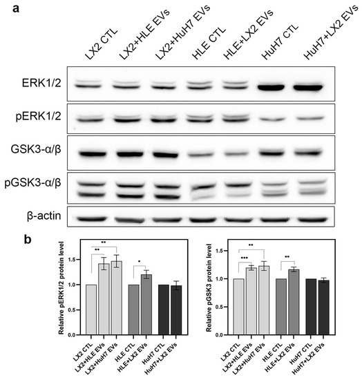 EVs from HLE and HuH7 upregulated pERK1/2 signaling and inhibited pGSK3-α/β in LX2 cells. A moderate pERK1/2 elevation was observed in HLE upon exposure to LX2 EVs. (a) Immunoblots and (b) corresponding densitometry graphs. β-actin housekeeping protein was used as a reference for protein loading and relative activity levels were compared to respective controls. Data points represent mean ± SD, n = 3; * p < 0.05; ** p < 0.01; and *** p < 0.001.